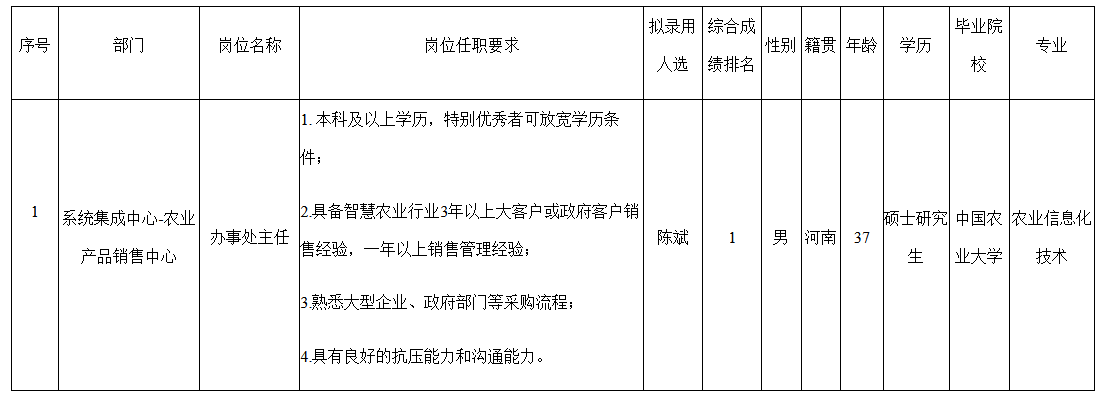 根據(jù)四川長(zhǎng)虹云數(shù)信息技術(shù)有限公司發(fā)布的招聘公告及招聘相關(guān)規(guī)定,經(jīng)面試程序,擬錄用陳斌同志到四川長(zhǎng)虹云數(shù)信息技術(shù)有限公司工作,現(xiàn)予以公示,具體情況如下: