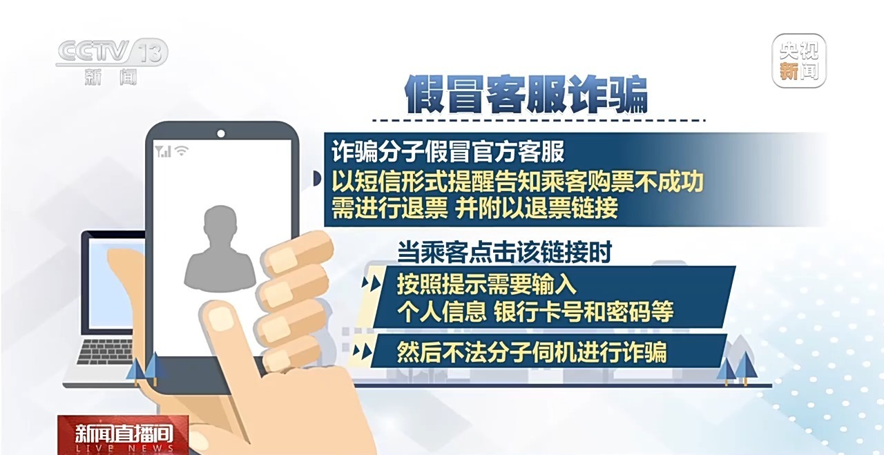 假冒客服詐騙:詐騙分子假冒官方客服以短信形式提醒告知乘客購票不成功,需進(jìn)行退票,并附以退票鏈接。當(dāng)乘客點(diǎn)擊該鏈接時(shí),按照提示需要輸入個(gè)人信息、銀行卡號(hào)和密碼等,然后不法分子伺機(jī)進(jìn)行詐騙。