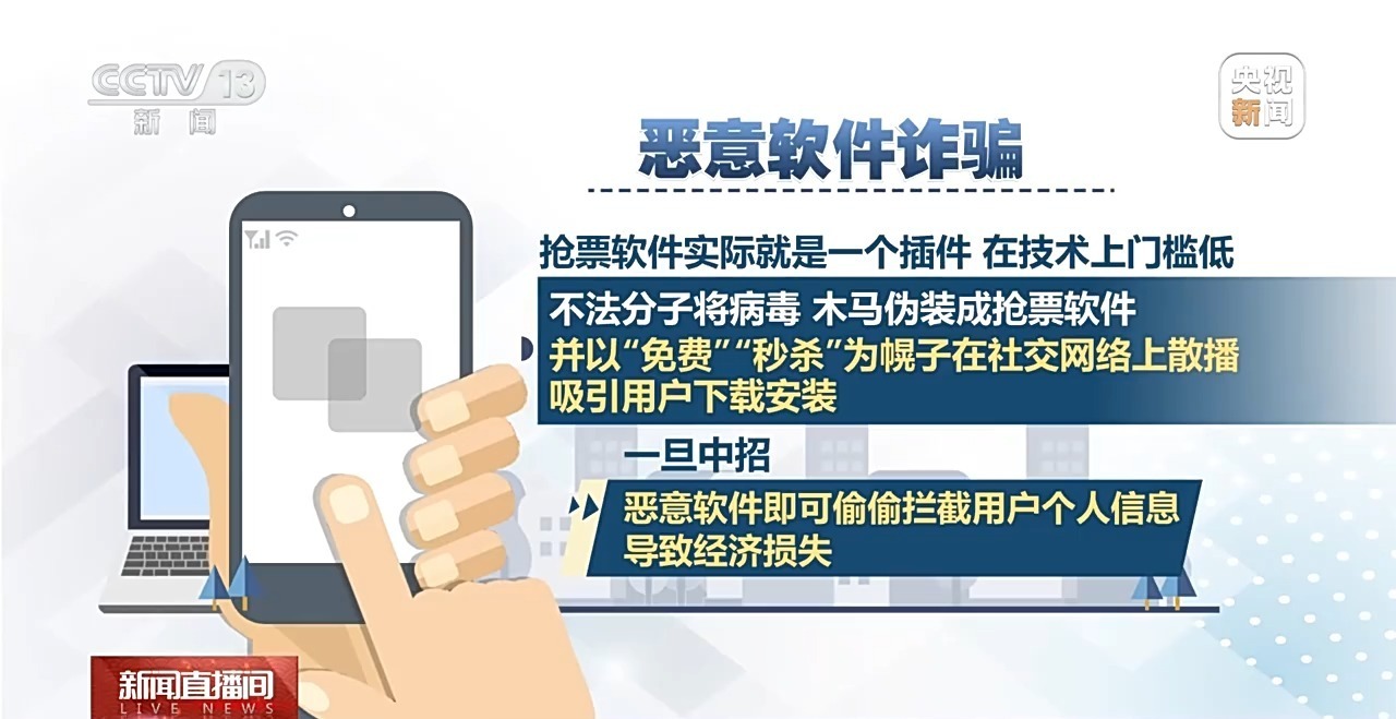 惡意軟件詐騙:搶票軟件實(shí)際就是一個(gè)插件,在技術(shù)上門檻低,不法分子將病毒、木馬偽裝成搶票軟件,并以“免費(fèi)”“秒殺”為幌子在社交網(wǎng)絡(luò)上散播,吸引用戶下載安裝。一旦中招,惡意軟件即可偷偷攔截用戶個(gè)人信息,導(dǎo)致經(jīng)濟(jì)損失。