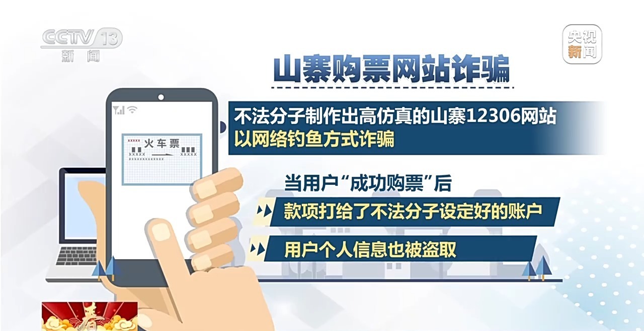 山寨購票網(wǎng)站詐騙:不法分子制作出高仿真的山寨12306網(wǎng)站,以網(wǎng)絡(luò)釣魚方式詐騙,這些網(wǎng)站在頁面布局、域名上與12306網(wǎng)站非常相似。當(dāng)用戶“成功購票”后,款項(xiàng)打給了不法分子設(shè)定好的賬戶,用戶個(gè)人信息也被盜取。