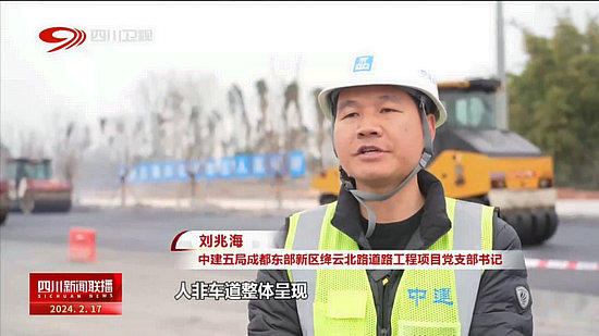 中建五局成都東部新區(qū)絳云北路道路工程項目黨支部書記 劉兆海:人非車道整體呈現(xiàn),二標段絳溪五線至絳云大道半幅水穩(wěn)層已完成,橋梁車行道箱梁架設(shè)完成,電力排管完成80%。