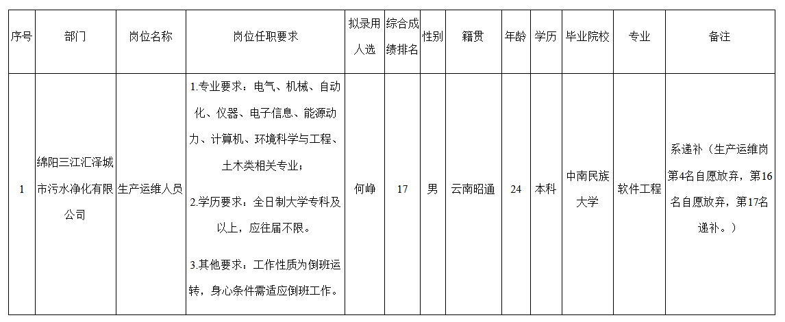 根據(jù)綿陽市水務(集團)有限公司發(fā)布的招聘公告及招聘相關規(guī)定,經(jīng)筆試、面試、考察、體檢等程序,擬錄用何崢同志到綿陽市水務(集團)有限公司工作,現(xiàn)予以公示,具體情況如下: