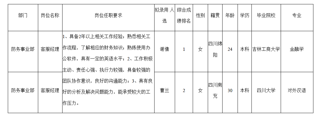根據(jù)四川華豐科技股份公司發(fā)布的招聘公告及招聘相關(guān)規(guī)定,經(jīng)筆試、面試、考察、體檢等程序,擬錄用謝倩等同志到四川華豐科技股份有限公司工作,現(xiàn)予以公示,具體情況如下: