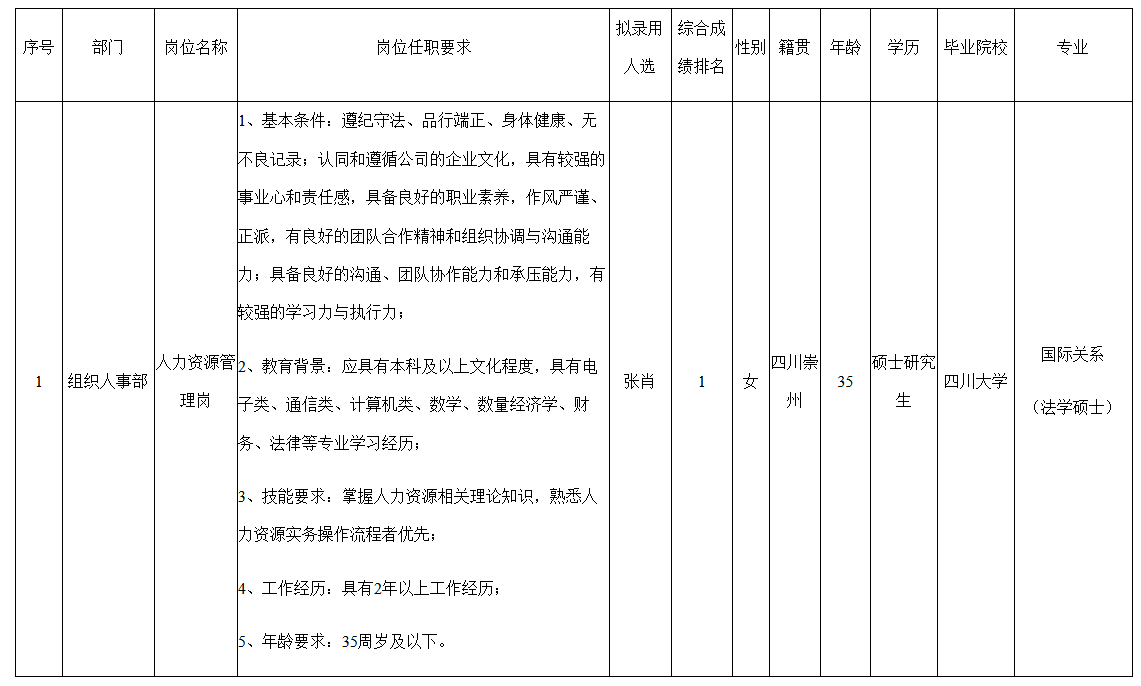根據(jù)四川九洲投資控股集團有限公司發(fā)布的招聘公告及招聘相關(guān)規(guī)定,經(jīng)筆試、面試、考察、體檢等程序,擬錄用張肖同志到四川九洲投資控股集團有限公司工作,現(xiàn)予以公示,具體情況如下: