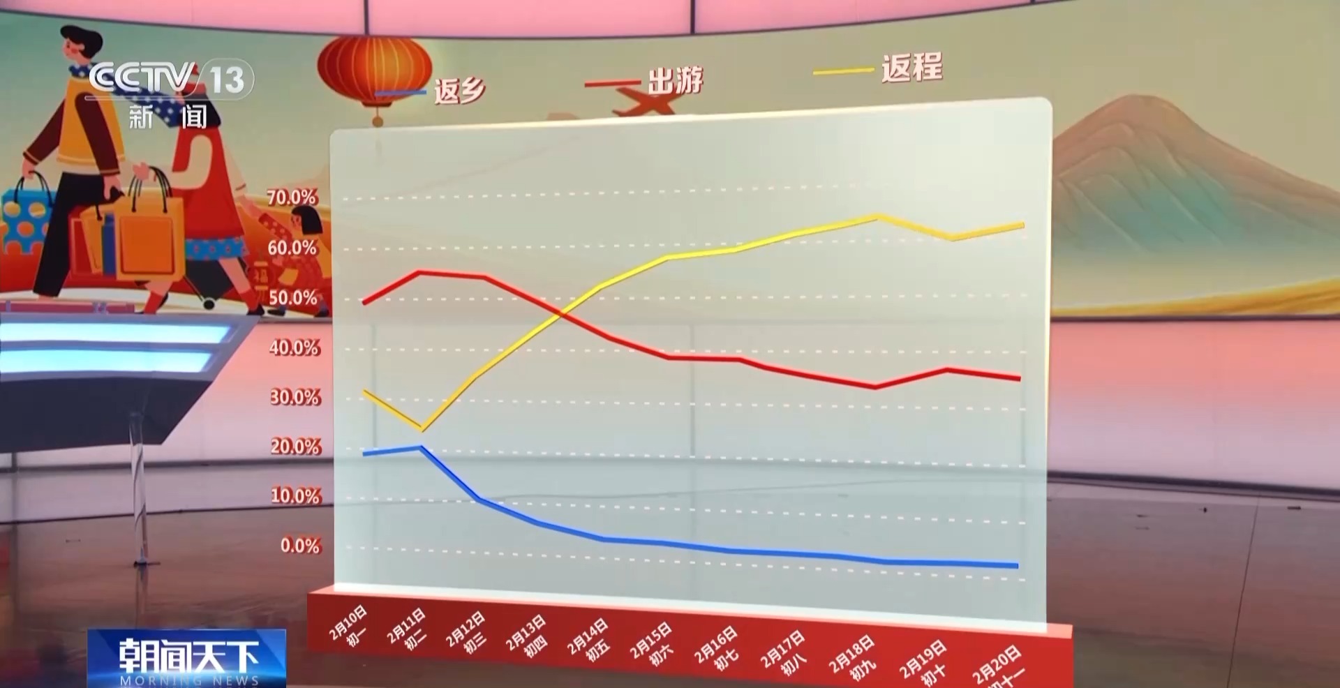 如果把人流分為返程、出游和返鄉(xiāng)等類型,我們看到,出游的人群從初一開始占據(jù)了更大的比例,一直到初五,返程才超過出游成為占比最高的人群,并逐漸上升。整體上看,返程客流占客流總量的比例,從初二的約四分之一上升到現(xiàn)在的六成以上。