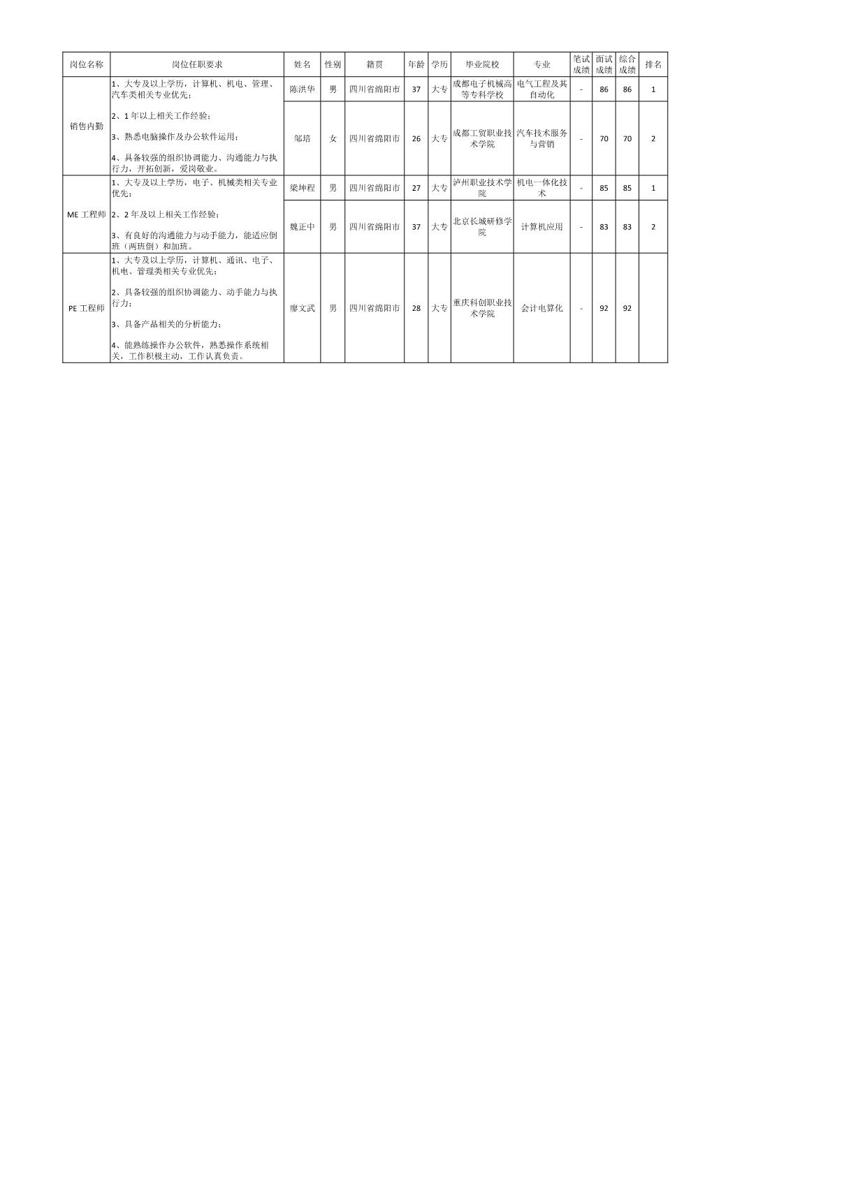 根據(jù)四川九州電子科技股份有限公司發(fā)布的招聘公告及招聘相關(guān)規(guī)定,經(jīng)筆試、面試等程序,現(xiàn)將筆試(面試)成績予以公示。