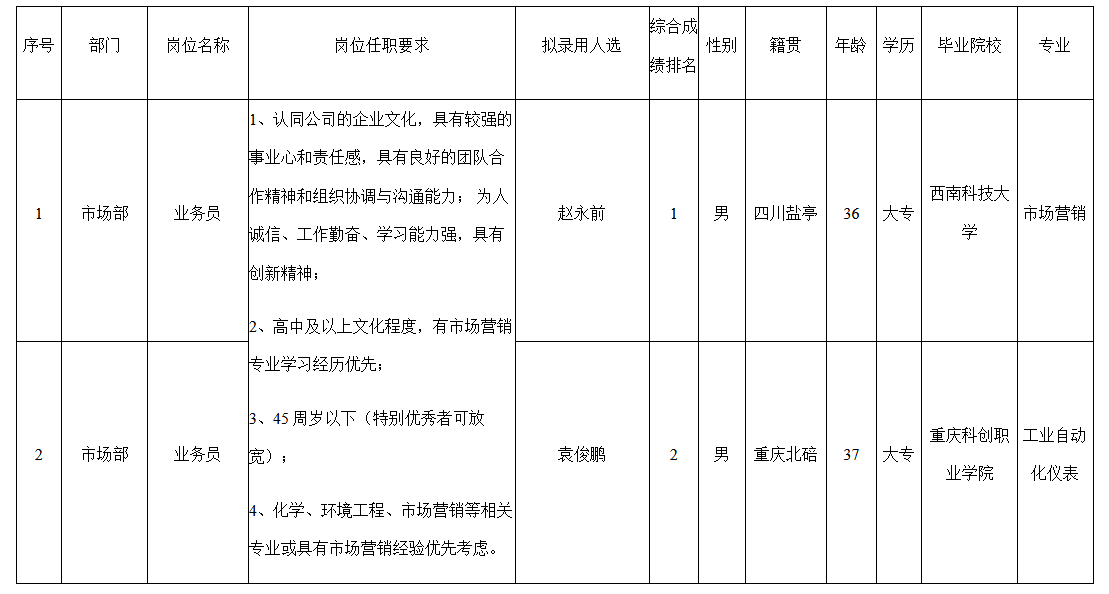 根據(jù)格潤中天公司發(fā)布的招聘公告及招聘相關(guān)規(guī)定,經(jīng)面試、體檢等程序,擬錄用趙永前、袁俊鵬同志到格潤中天市場部工作,現(xiàn)予以公示,具體情況如下: