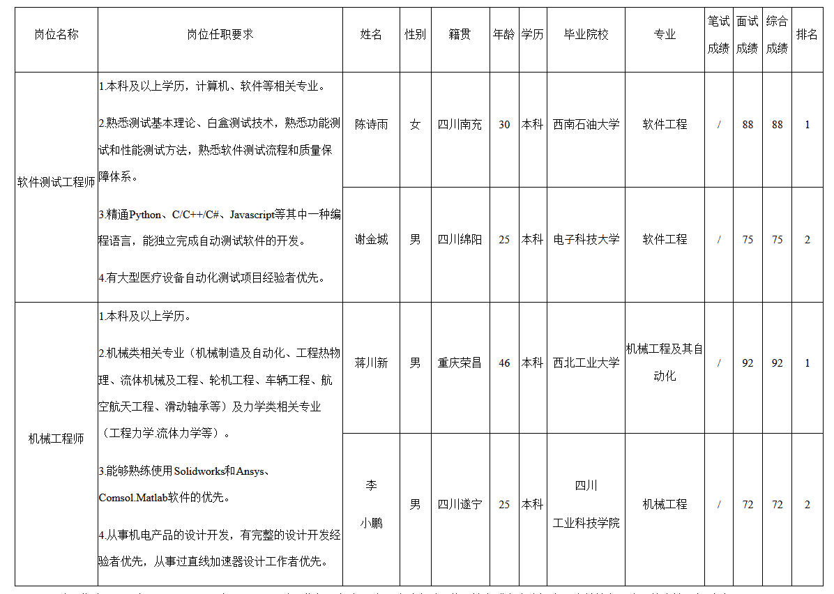 根據(jù)中玖閃光醫(yī)療科技有限公司發(fā)布的招聘公告及招聘相關(guān)規(guī)定,經(jīng)面試程序,現(xiàn)將面試成績(jī)予以公示。