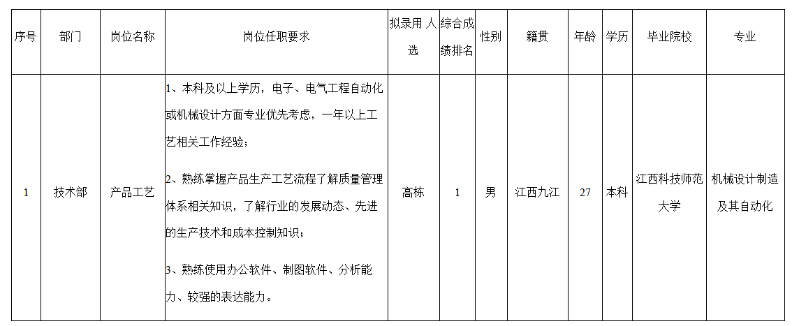 根據(jù)中山長虹電器有限公司發(fā)布的招聘公告及招聘相關(guān)規(guī)定,經(jīng)面試、考察、體檢等程序,擬錄用高棟同志到產(chǎn)品工藝工作,現(xiàn)予以公示,具體情況如下: