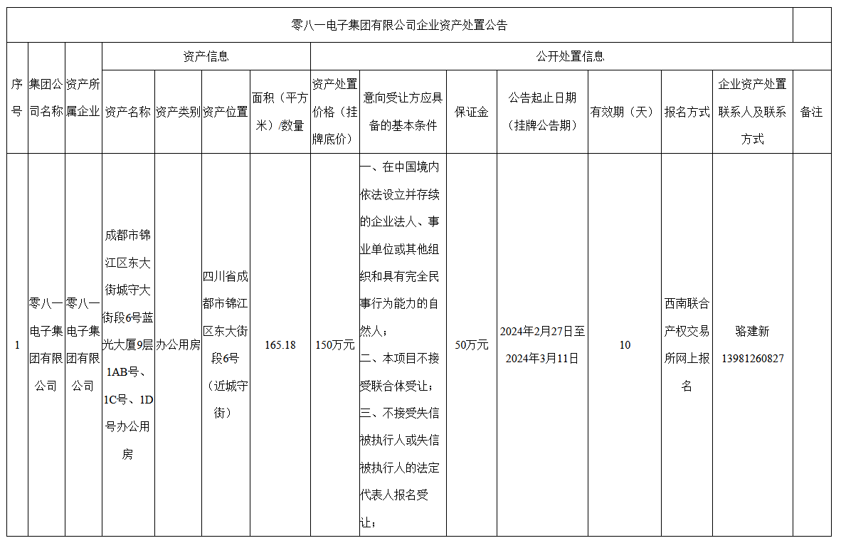 零八一電子集團(tuán)有限公司企業(yè)資產(chǎn)處置公告