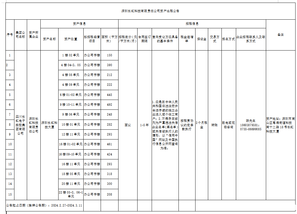 深圳長虹科技有限責(zé)任公司資產(chǎn)出租公告