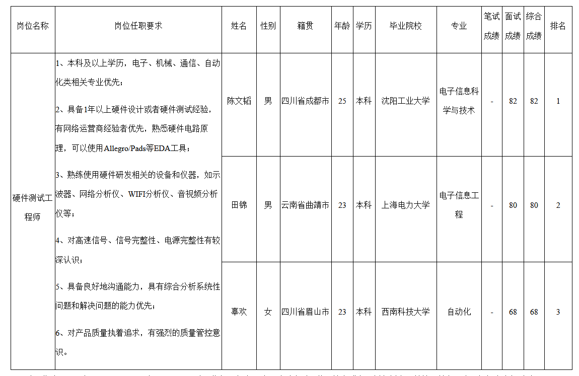 根據(jù)四川九州電子科技股份有限公司發(fā)布的招聘公告及招聘相關(guān)規(guī)定,經(jīng)筆試、面試等程序,現(xiàn)將筆試(面試)成績(jī)予以公示。