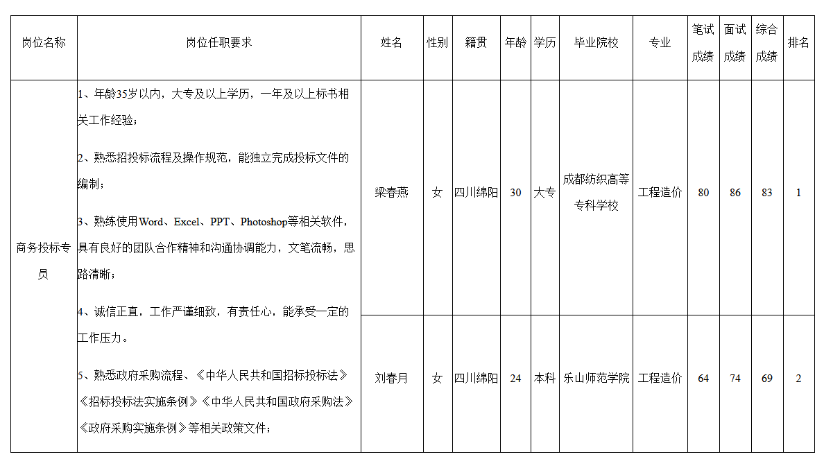 根據(jù)四川長虹智慧健康科技有限公司發(fā)布的招聘公告及招聘相關(guān)規(guī)定,經(jīng)筆試、面試等程序,現(xiàn)將筆試(面試)成績予以公示。