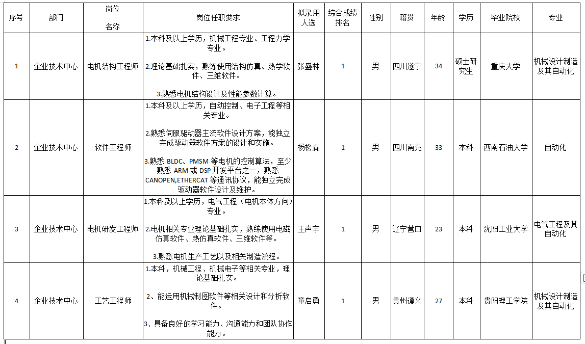 根據(jù)成都微精電機股份公司發(fā)布的招聘公告及招聘相關(guān)規(guī)定,經(jīng)面試、考察、體檢等程序,擬錄用張盛林等4名同志到成都微精電機股份公司工作,現(xiàn)予以公示,具體情況如下: