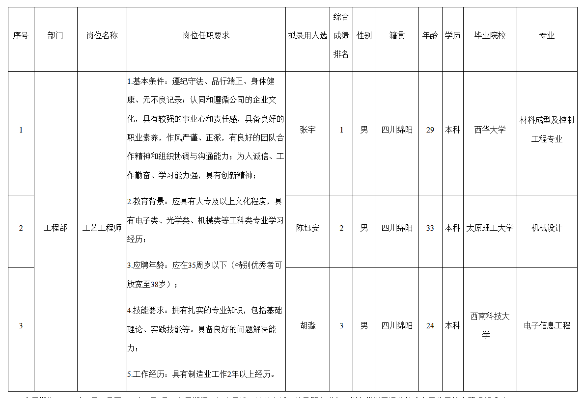 根據(jù)四川九華光子通信技術(shù)有限公司發(fā)布的招聘公告及招聘相關(guān)規(guī)定,經(jīng)面試、考察、體檢等程序,擬錄用張宇等同志到四川九華光子通信技術(shù)有限公司工作,現(xiàn)予以公示,具體情況如下: