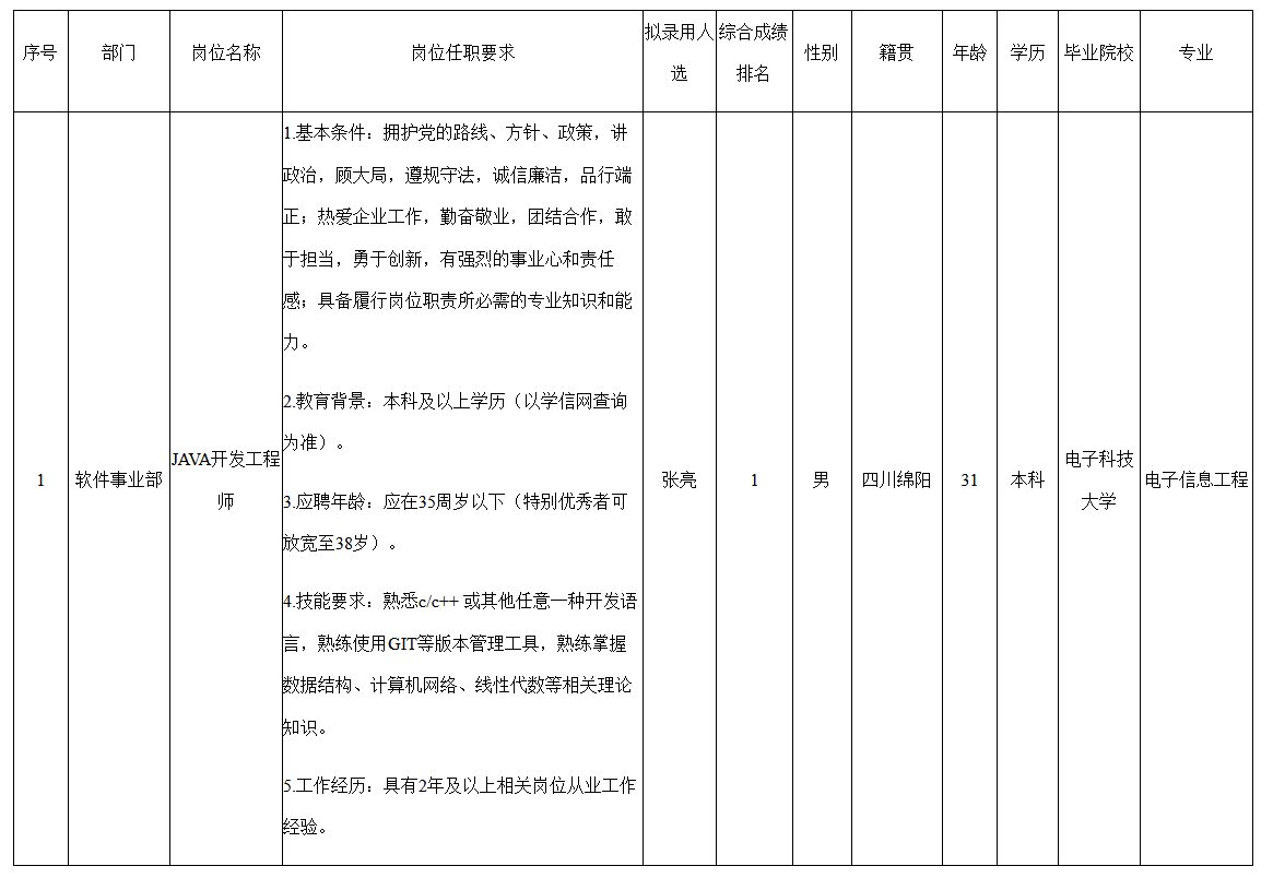根據(jù)四川九強通信科技有限公司發(fā)布的招聘公告及招聘相關(guān)規(guī)定,經(jīng)筆試、面試、考察、體檢等程序,擬錄用張亮同志到四川九強通信科技有限公司工作,現(xiàn)予以公示,具體情況如下:
