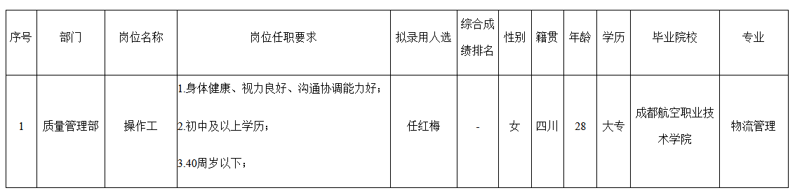 根據(jù)宜賓紅星電子有限公司發(fā)布的招聘公告及招聘相關(guān)規(guī)定,經(jīng)面試、考察、體檢等程序,擬錄用任紅梅同志到宜賓紅星電子有限公司工作,現(xiàn)予以公示,具體情況如下: