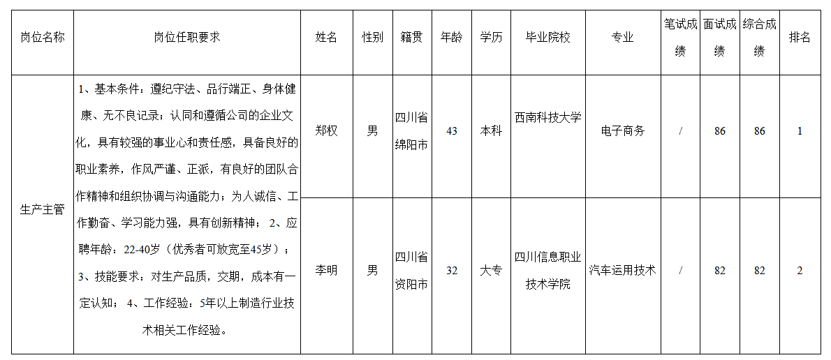 根據(jù)四川九華光子通信技術(shù)有限公司發(fā)布的招聘公告及招聘相關(guān)規(guī)定,經(jīng)筆試、面試等程序,現(xiàn)將筆試(面試)成績(jī)予以公示。