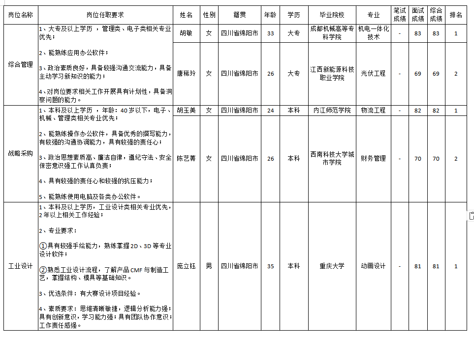 根據(jù)四川九州電子科技股份有限公司發(fā)布的招聘公告及招聘相關(guān)規(guī)定,經(jīng)筆試、面試等程序,現(xiàn)將筆試(面試)成績予以公示。