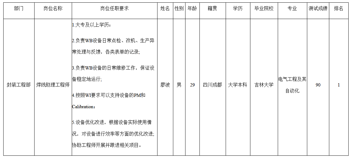 根據(jù)四川啟賽微電子有限公司發(fā)布的招聘公告及招聘相關(guān)規(guī)定,經(jīng)用人單位面試程序,現(xiàn)將測(cè)試合格人員予以公示。