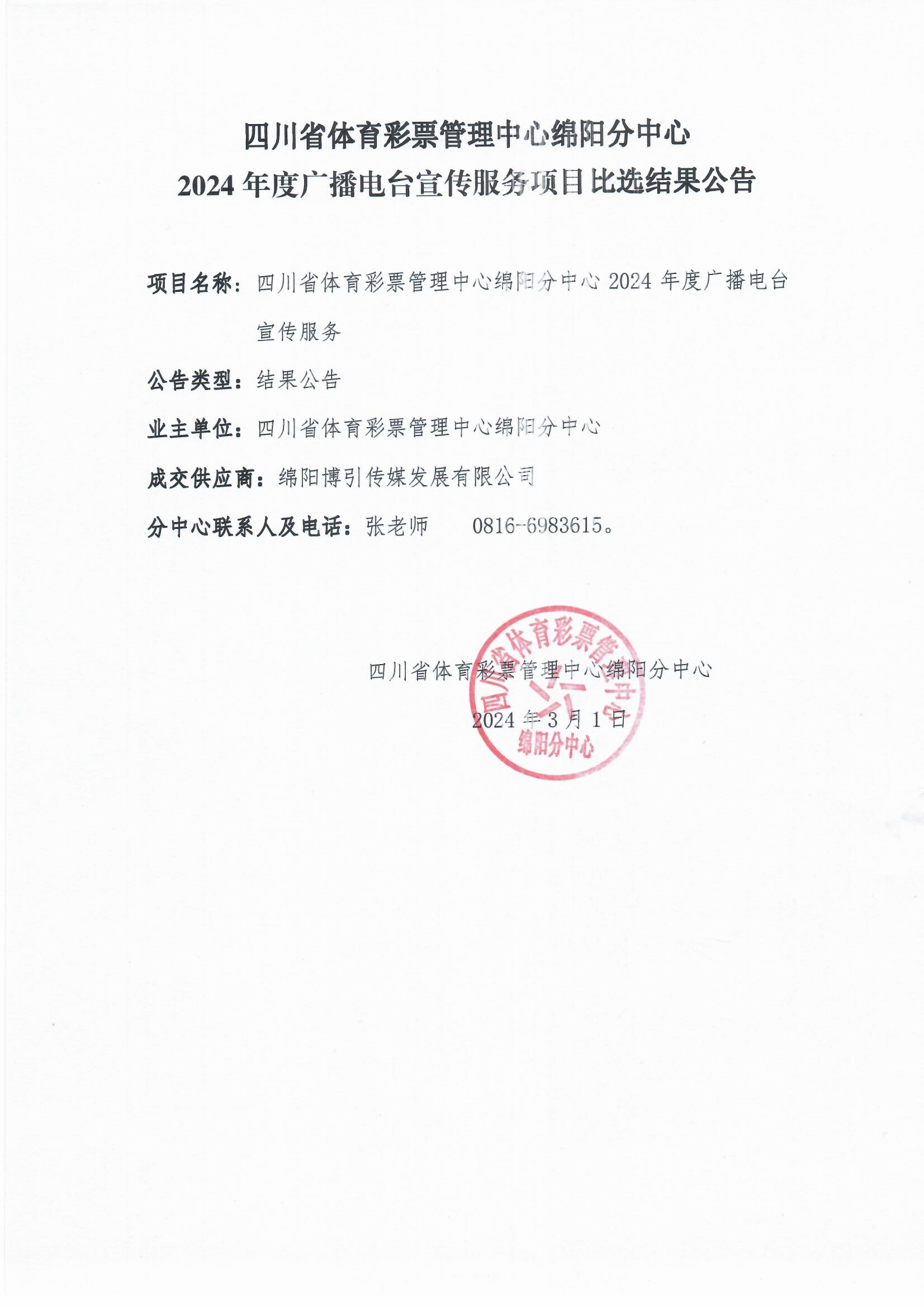 四川省體育彩票管理中心綿陽分中心2024年度廣播電臺宣傳服務項目比選結(jié)果公告