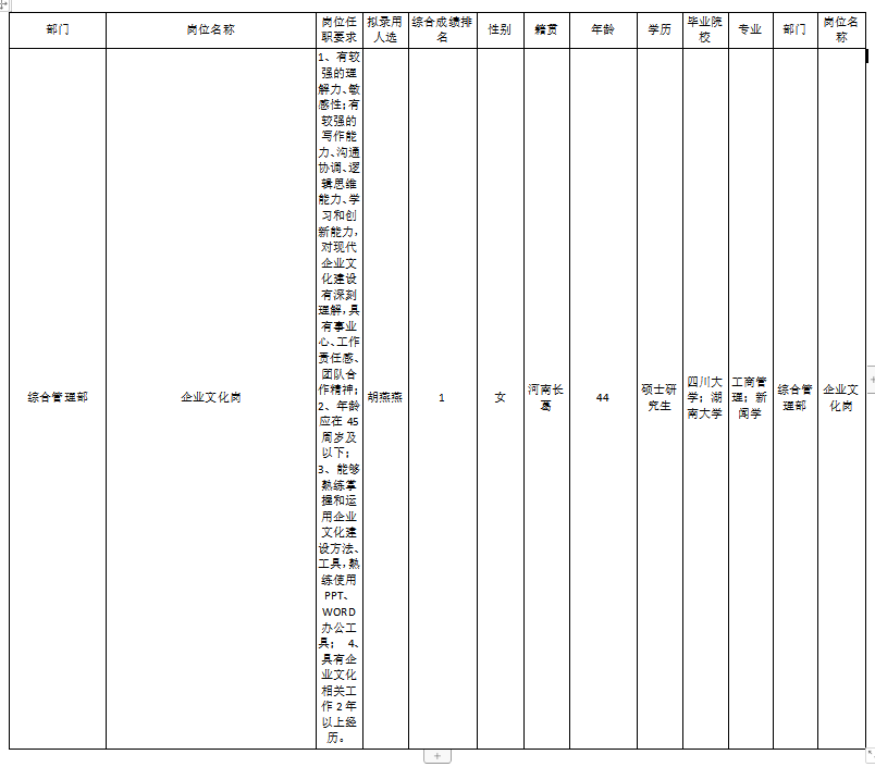 根據(jù)四川九州空管科技有限責(zé)任公司發(fā)布的招聘公告及招聘相關(guān)規(guī)定,經(jīng)筆試、面試、考察、體檢等程序,擬錄用胡燕燕,范利瓊同志到四川九州空管科技有限責(zé)任公司工作,現(xiàn)予以公示,具體情況如下: