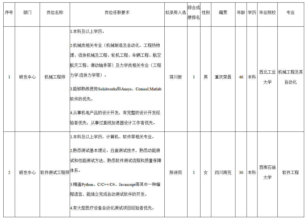 根據(jù)中玖閃光醫(yī)療科技有限公司發(fā)布的招聘公告及招聘相關(guān)規(guī)定,經(jīng)過篩選、面試、體檢等程序,擬錄用蔣川新、陳詩雨等同志到中玖閃光醫(yī)療科技有限公司工作,現(xiàn)予以公示,具體情況如下: