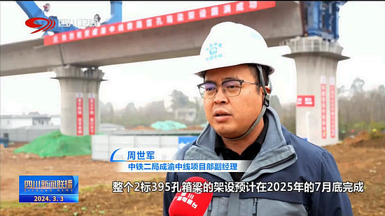 中鐵二局成渝中線項目部 副經(jīng)理 周世軍:按照一天一孔的進(jìn)度正常推進(jìn),整個2標(biāo)395孔箱梁的架設(shè)預(yù)計在2025年的7月底完成。整個成渝中線四川段有6個架梁標(biāo)段,逐步進(jìn)行預(yù)制和架設(shè)任務(wù)。