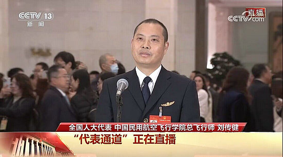 走上“代表通道”的劉傳健,身著帥氣的機長服。2022年,他從川航調任中飛院任總飛行師,但每年仍堅持飛行200小時以上,機長身份仍在。