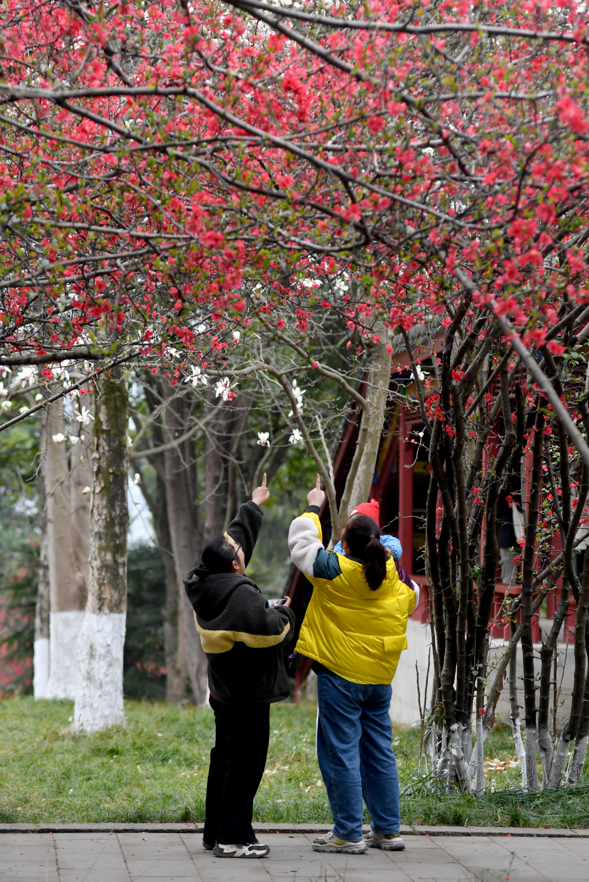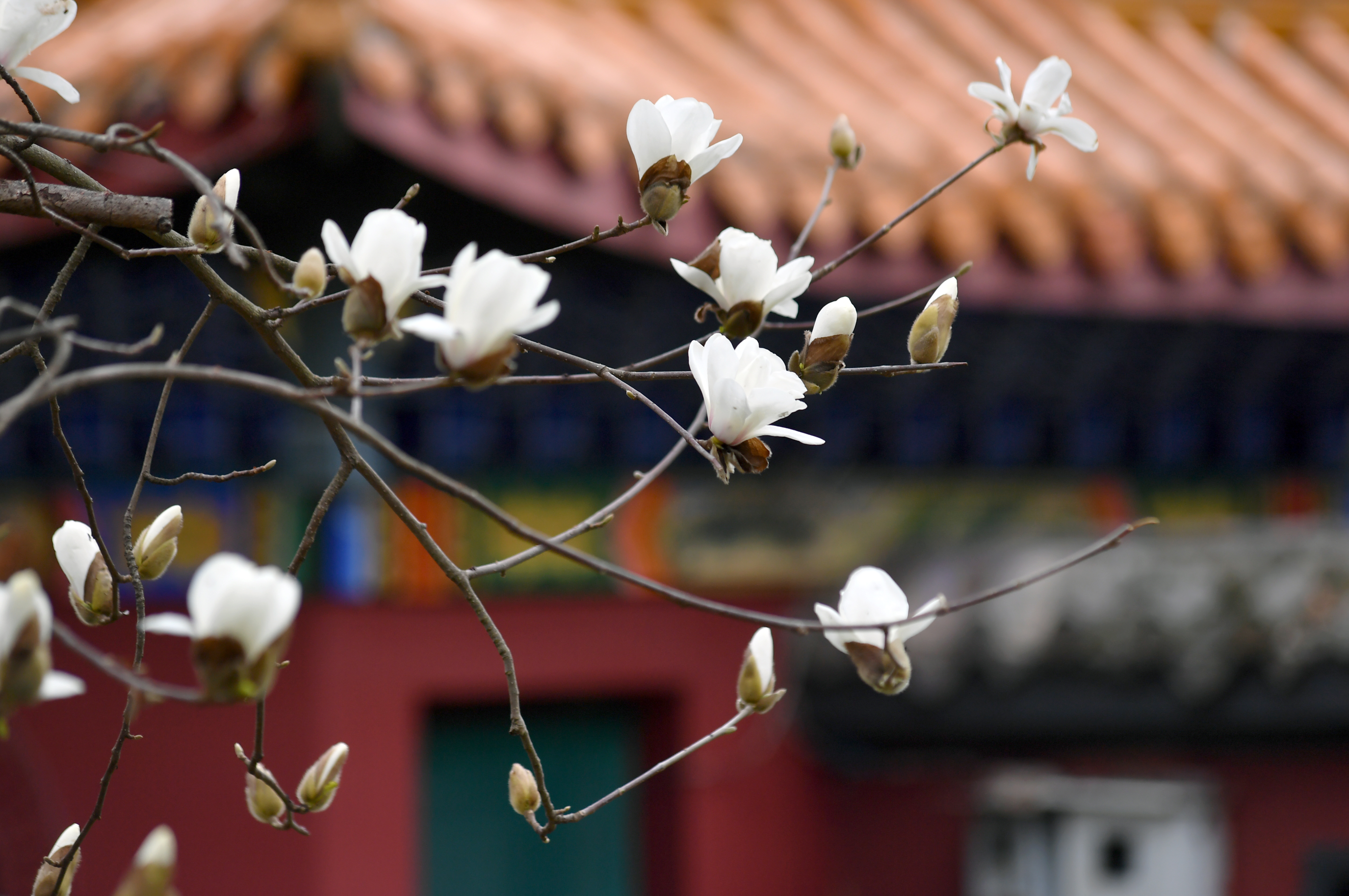 在富樂山,一朵朵潔白碩大的玉蘭花與古香古色的紅墻黃瓦、飛檐脊獸相互映襯,呈現(xiàn)出一幅韻味十足的詩意美景圖,吸引了許多市民觀賞和拍照。