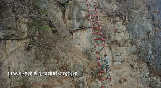 1966年修建成昆鐵路的鐵道兵們?yōu)楣怕反宕迕?,在通往外界的藤梯的基礎(chǔ)上焊起鋼梯。