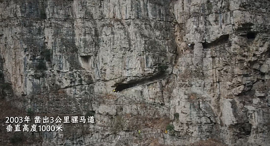 2003年當?shù)卣疄榇迕裨诮^壁上鑿出一條長3公里,垂直高度近1000米的騾馬道,方便村民出行。