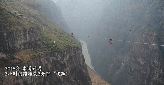 2018年,跨度為760米的索道正式開通,村民們3小時的崎嶇懸崖路只需要3分鐘就可“飛躍”。