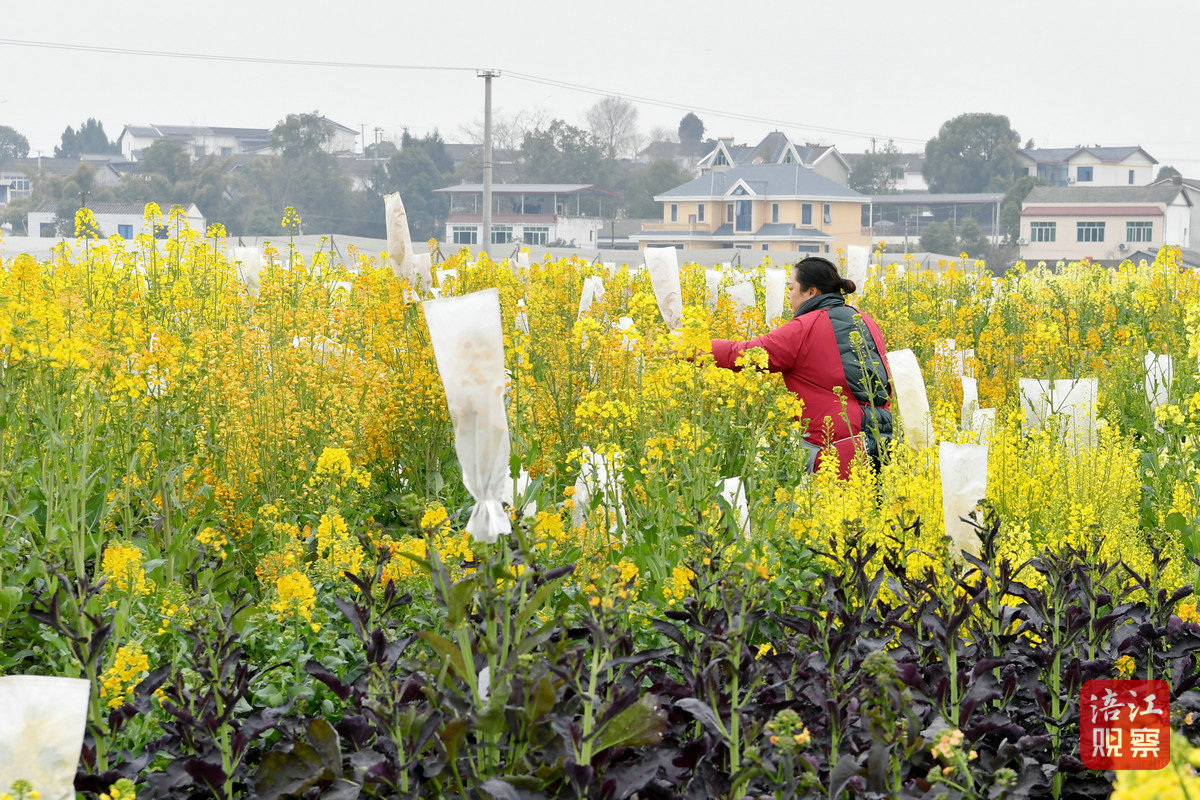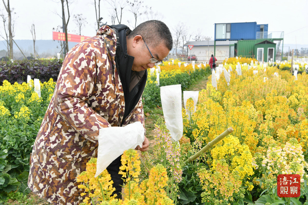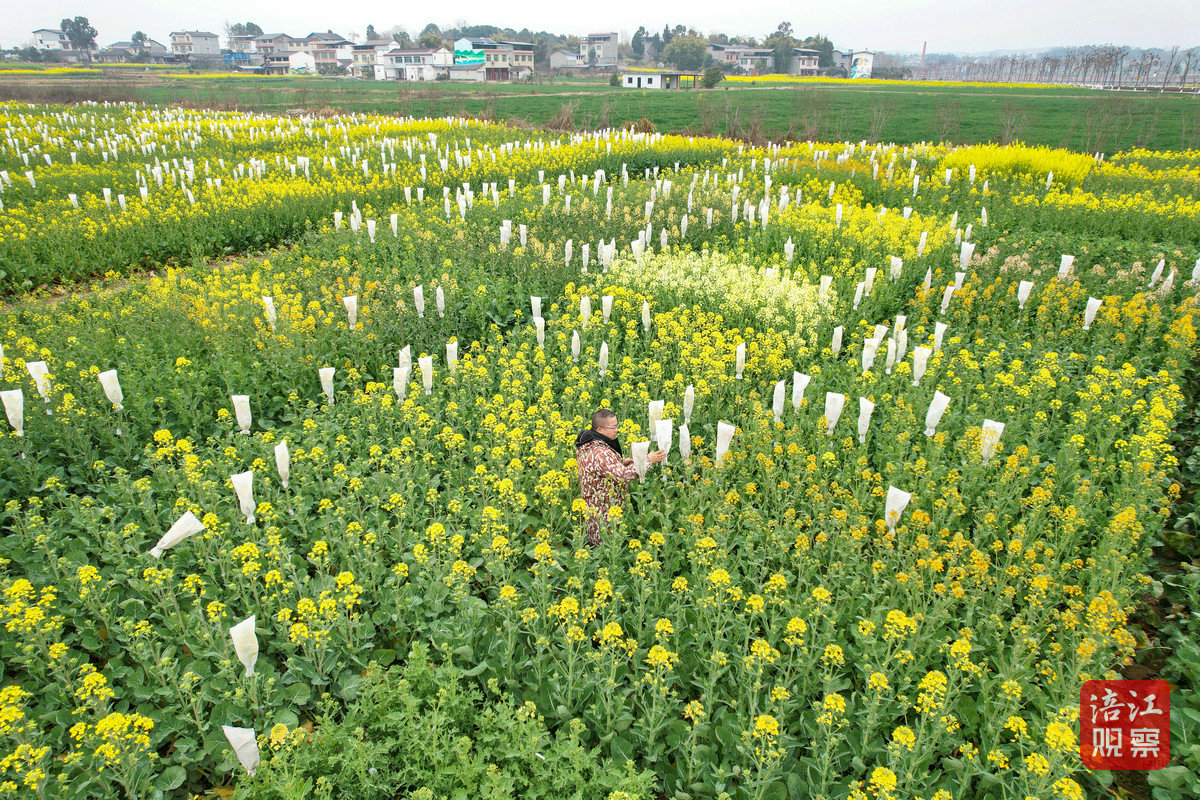3月5日,在位于綿陽游仙區(qū)新橋鎮(zhèn)勝黎路一側(cè)的一大片油菜田里,一株株套著白色育種袋的油菜花顯得格外醒目,每一株上面還系著一個手寫掛牌。田埂間,“新農(nóng)人”袁中勇和妻子正對套著袋子的油菜花挨個進行檢查。隨著油菜花的生長,育種袋的高度需要及時調(diào)整。