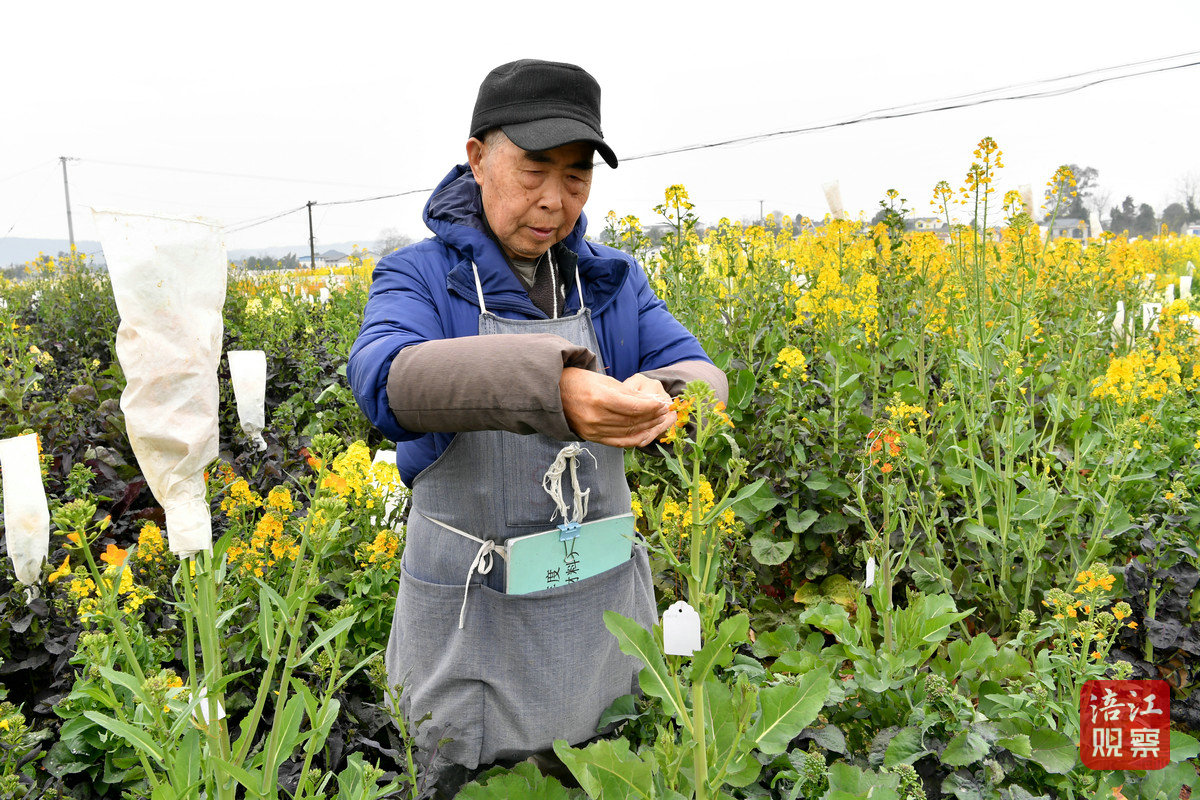 不遠處,86歲的父親袁代斌系著圍裙,對每一株套袋的油菜花進行詳細登記并制作掛牌。“這就好比是人的身份證,登記日期、開花時間、在哪一壟、是哪一株等內(nèi)容都要寫清楚。”從市農(nóng)科院退休后,袁代斌繼續(xù)發(fā)揮余熱,與兒子、女婿一起進行油菜育種。“套袋子的目的是為了保持種子的純度。”袁代斌說,等到種子成熟以后,取下袋子,將剪下的部分放進掛儲室自然晾干搓下油菜籽后,才能進入實驗室等其它程序。