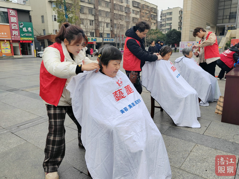 活動中,大家來到轄區(qū)廣場為老人免費(fèi)理發(fā)。只見家長們一只手拿著剪刀,一只手拿著梳子,神情專注地為老人剪發(fā),孩子們則在一旁協(xié)助理發(fā),有的為老人整理衣服,有的為老人捶腿揉肩。