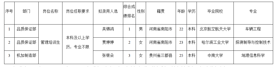 根據(jù)四川波鴻實業(yè)有限公司發(fā)布的招聘公告及招聘相關(guān)規(guī)定,經(jīng)面試等程序,擬錄用以下人員為威斯卡特工業(yè)(中國)有限公司管理培訓(xùn)生,現(xiàn)予以公示,具體情況如下:
