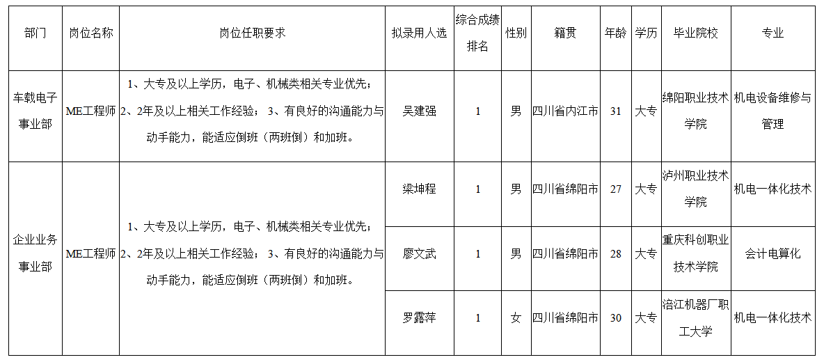 根據(jù)四川九州電子科技股份有限公司發(fā)布的招聘公告及招聘相關(guān)規(guī)定,經(jīng)筆試、面試、考察、體檢等程序,擬錄用梁坤程,廖文武,羅露萍,吳建強(qiáng)同志到四川九州電子科技股份有限公司工作,現(xiàn)予以公示,具體情況如下: