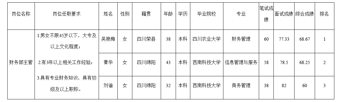 根據(jù)綿陽(yáng)市綿州嘉來(lái)會(huì)務(wù)服務(wù)有限公司發(fā)布的招聘公告及招聘相關(guān)規(guī)定,經(jīng)筆試、面試等程序,現(xiàn)將成績(jī)予以公示。