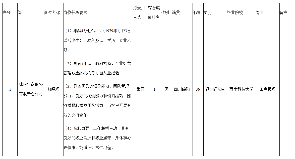 根據(jù)綿陽人才集團(tuán)發(fā)布的招聘公告及招聘相關(guān)規(guī)定,經(jīng)能力測試、面試、背景調(diào)查、考察、體檢等程序,擬錄用焦晉同志到綿陽招商服務(wù)有限責(zé)任公司工作,現(xiàn)予以公示,具體情況如下:
