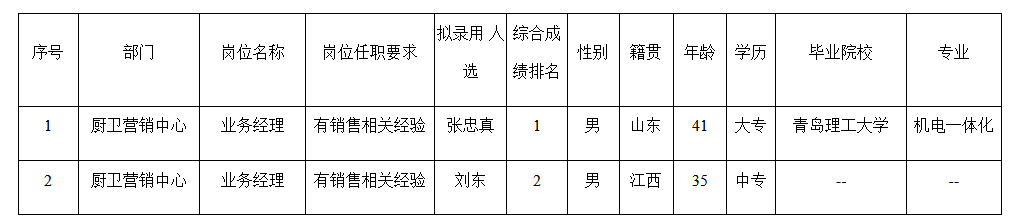 根據(jù)合肥長(zhǎng)虹美菱生活電器有限公司發(fā)布的招聘公告及招聘相關(guān)規(guī)定,經(jīng)面試、體檢等程序,擬錄用張忠真、劉東同志到合肥長(zhǎng)虹美菱生活電器有限公司工作,現(xiàn)予以公示,具體情況如下:
