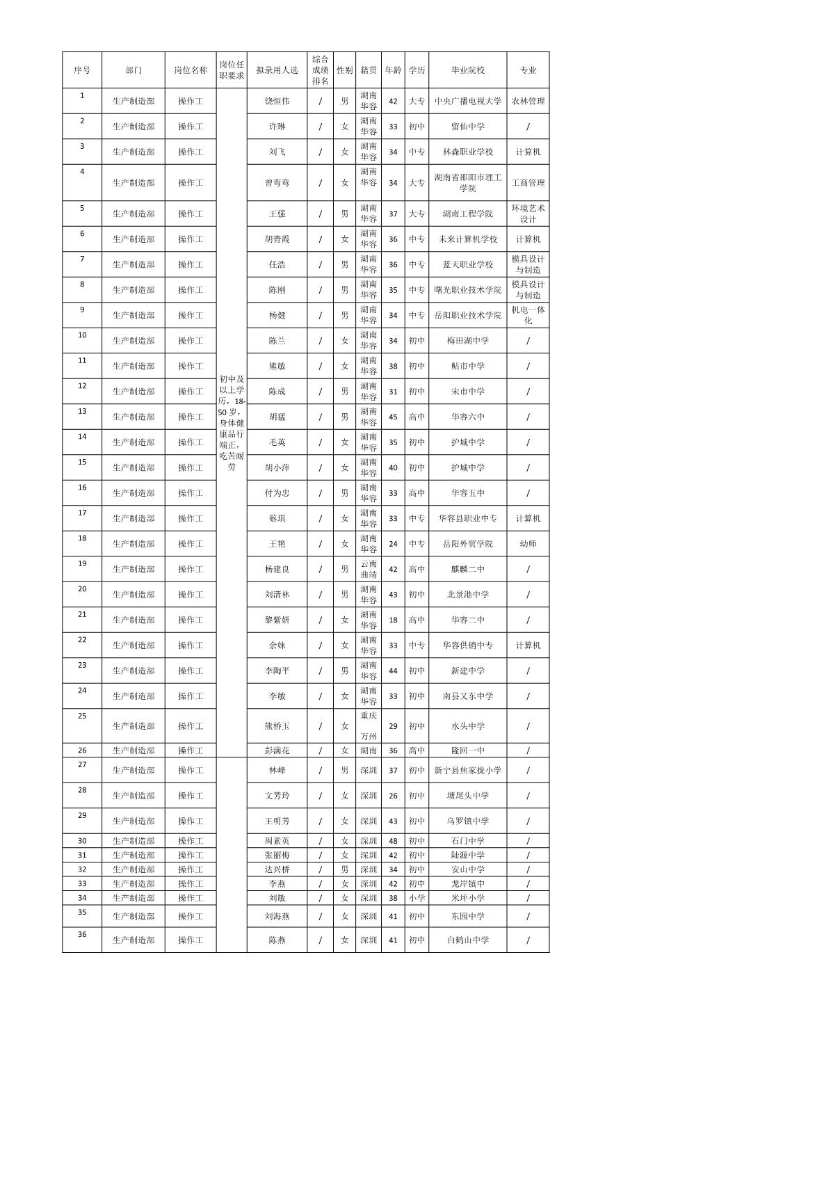 根據(jù)深圳長(zhǎng)虹聚和源科技有限公司發(fā)布的招聘公告及招聘相關(guān)規(guī)定,經(jīng)筆試、面試、考察、體檢等程序,擬錄用以下同志到公司生產(chǎn)制造部工作,現(xiàn)予以公示,具體情況如下: