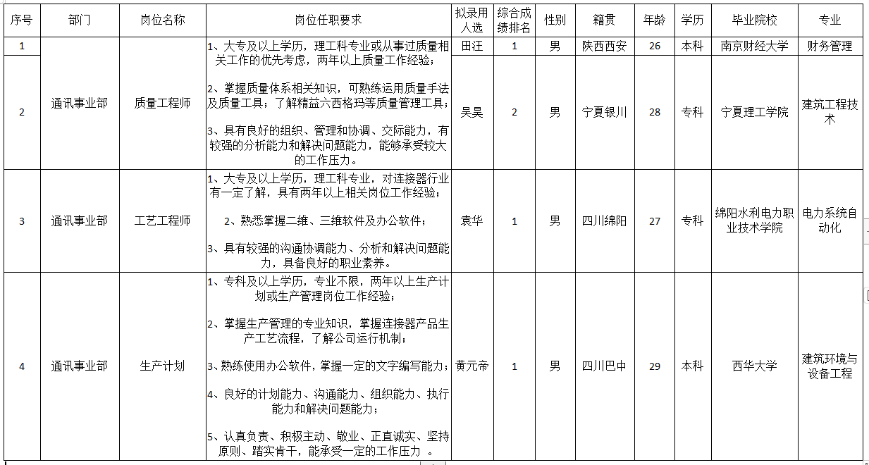 根據(jù)四川華豐科技股份公司發(fā)布的招聘公告及招聘相關(guān)規(guī)定,經(jīng)筆試、面試、考察、體檢等程序,擬錄用田汪等同志到四川華豐科技股份有限公司工作,現(xiàn)予以公示,具體情況如下: