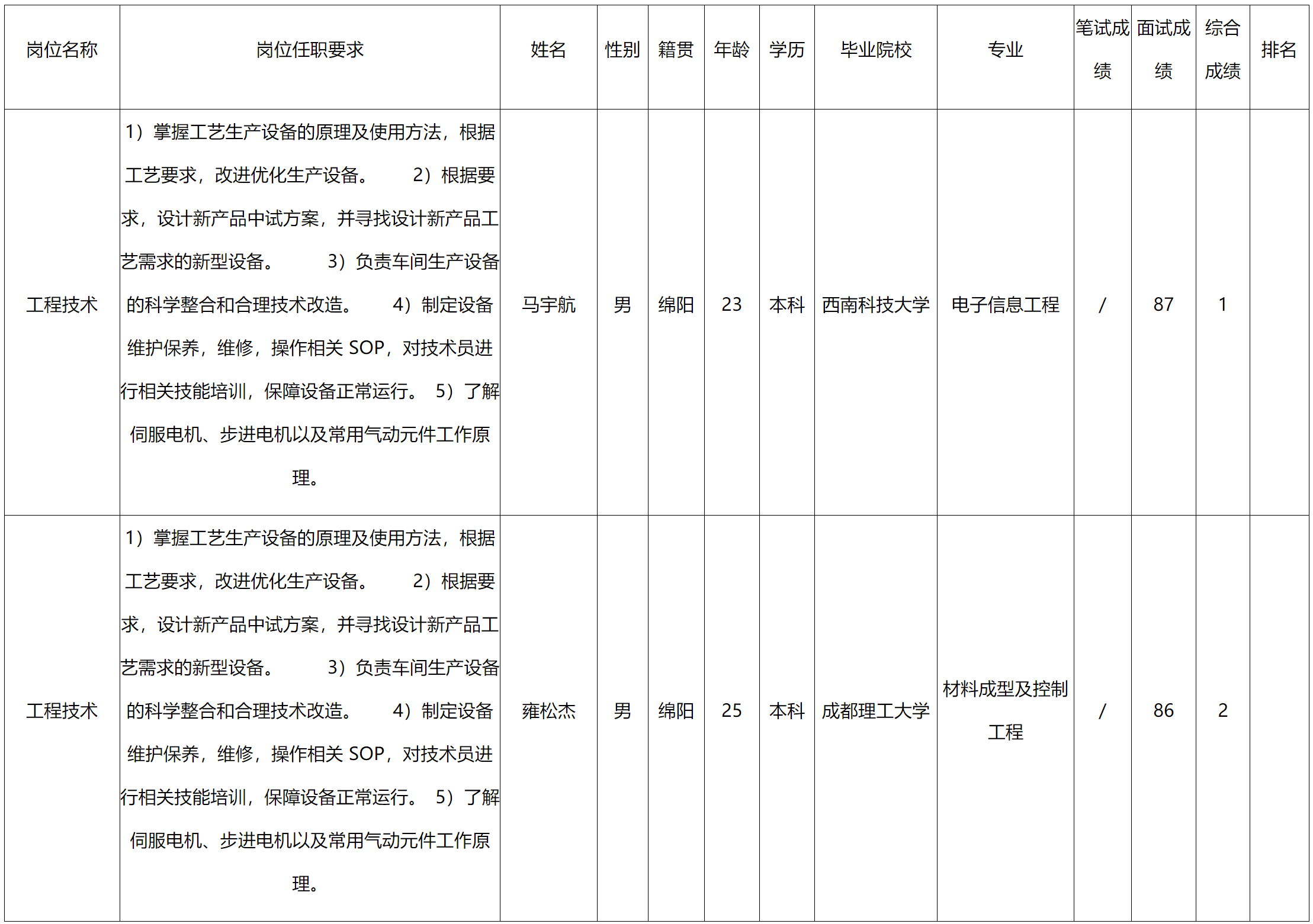 根據四川長虹器件科技有限公司發(fā)布的招聘公告及招聘相關規(guī)定,經筆試、面試等程序,現將筆試(面試)成績予以公示。