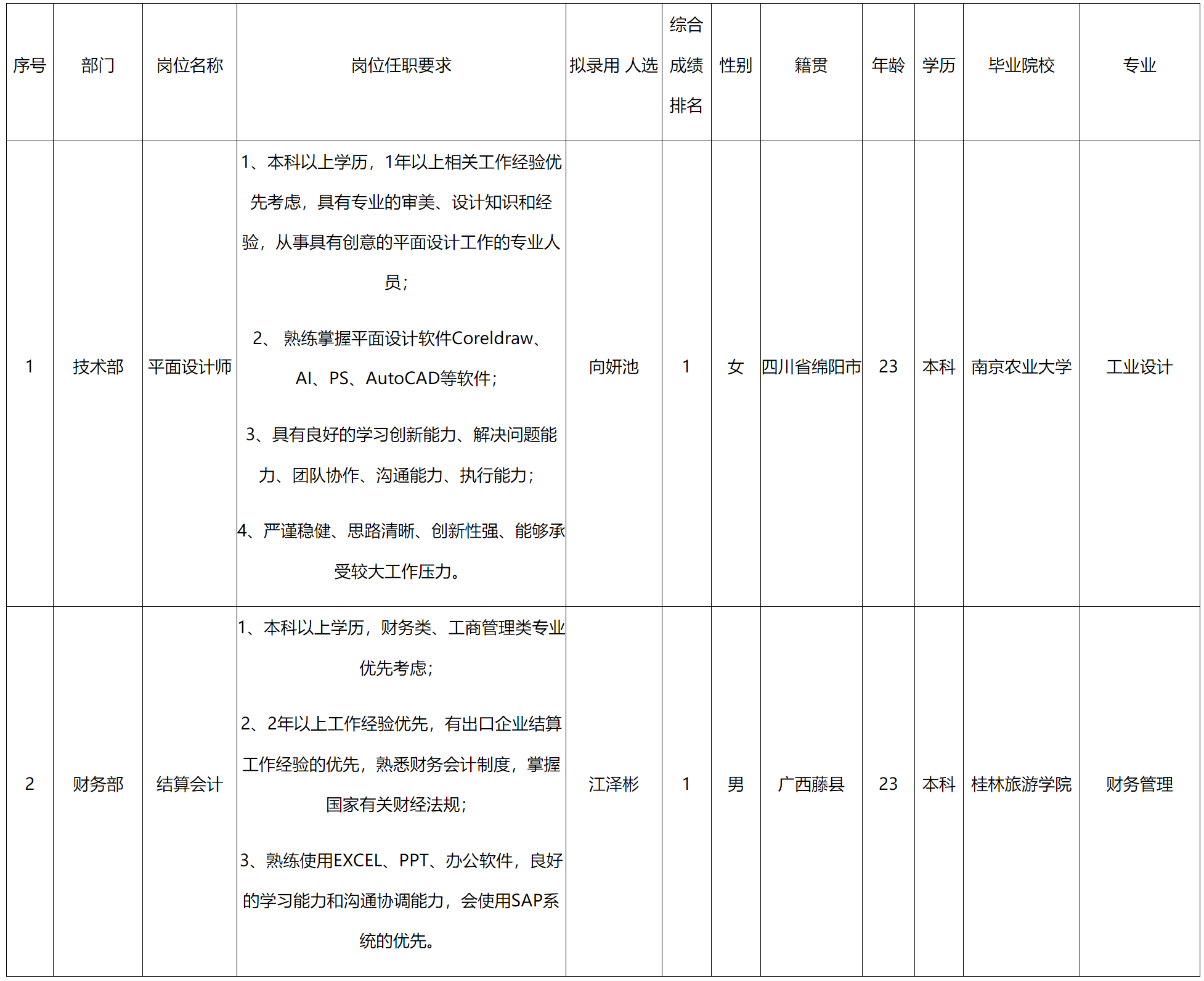 根據(jù)中山長(zhǎng)虹電器有限公司發(fā)布的招聘公告及招聘相關(guān)規(guī)定,經(jīng)面試、考察、體檢等程序,擬錄用向妍池同志到平面設(shè)計(jì)師、江澤彬同志到結(jié)算會(huì)計(jì)崗位工作,現(xiàn)予以公示,具體情況如下: