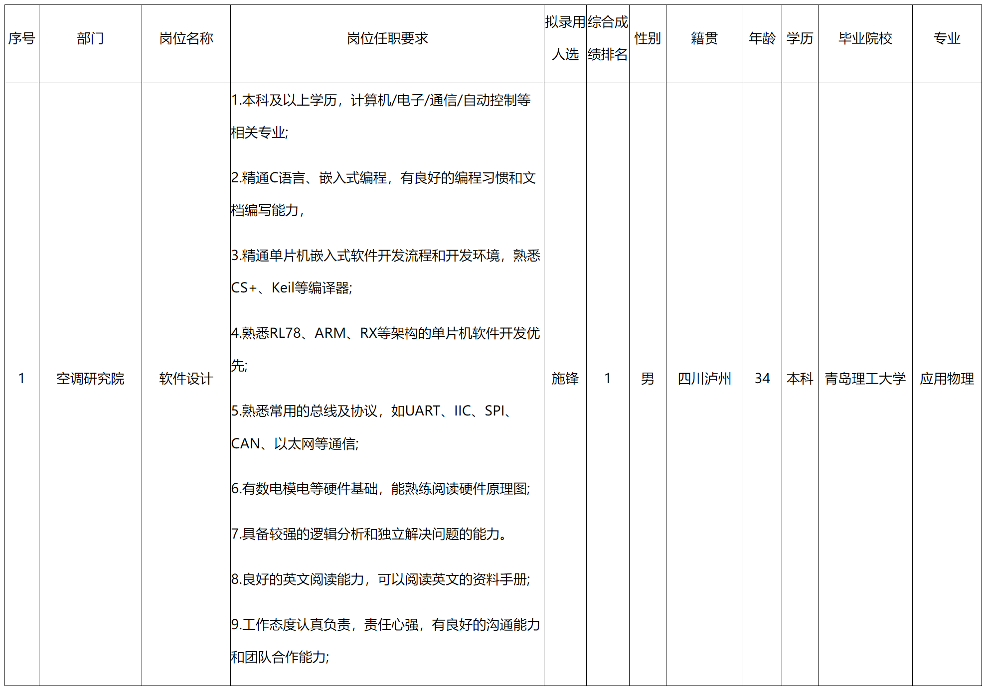 根據(jù)四川長(zhǎng)虹空調(diào)有限公司發(fā)布的招聘公告及招聘相關(guān)規(guī)定,經(jīng)面試、體檢等程序,擬錄用施鋒到長(zhǎng)虹空調(diào)工作,現(xiàn)予以公示,具體情況如下: