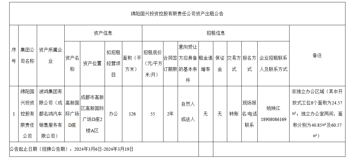 綿陽國興投資控股有限責任公司資產(chǎn)出租公告