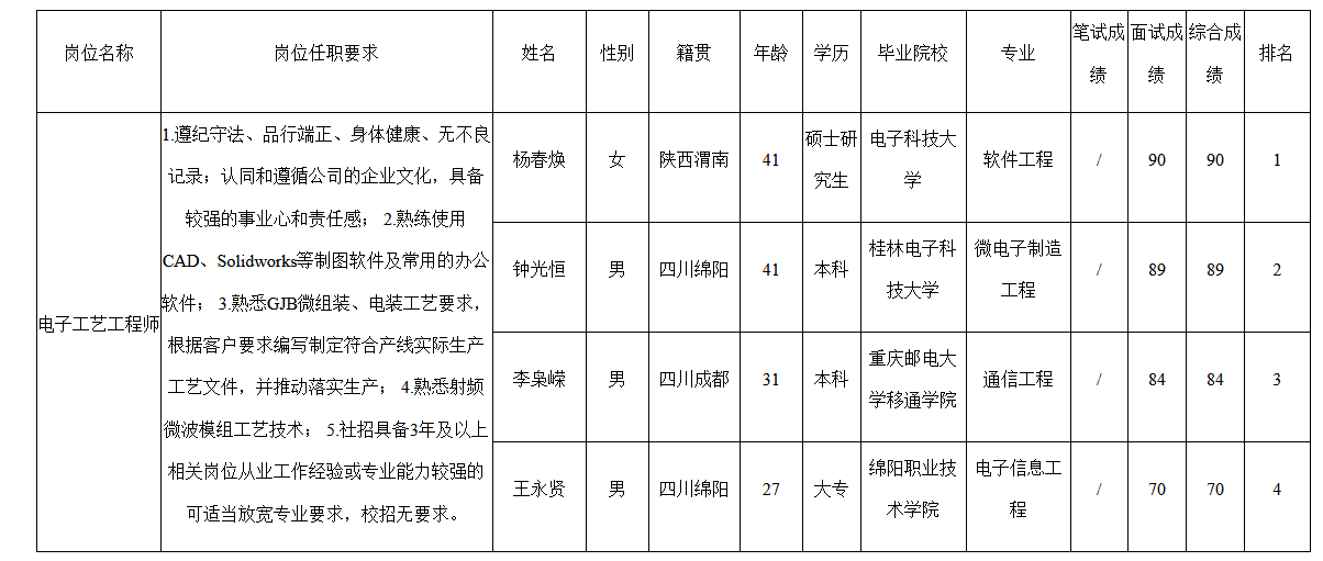 根據(jù)四川九強(qiáng)通信科技有限公司發(fā)布的招聘公告及招聘相關(guān)規(guī)定,經(jīng)筆試、面試等程序,現(xiàn)將筆試(面試)成績(jī)予以公示。