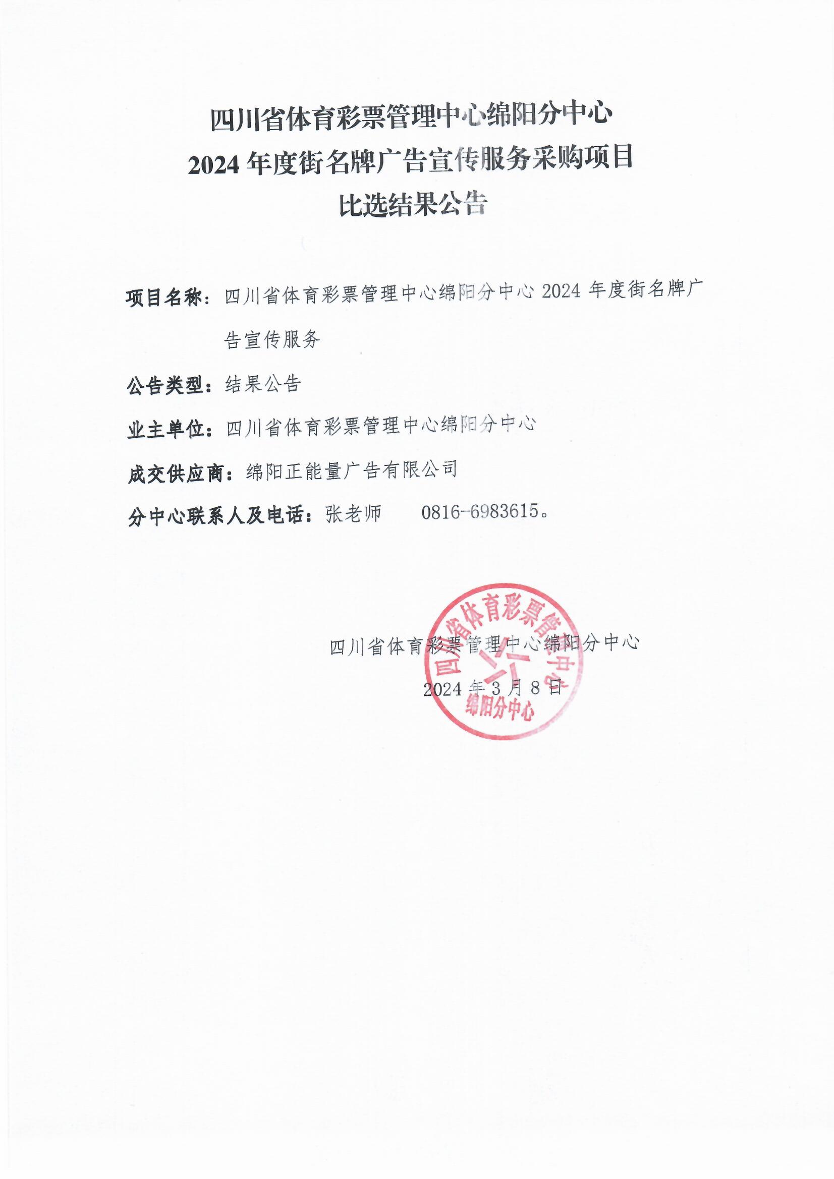 四川省體育彩票管理中心綿陽分中心2024年度街名牌廣告宣傳服務(wù)采購項(xiàng)目比選結(jié)果公告
