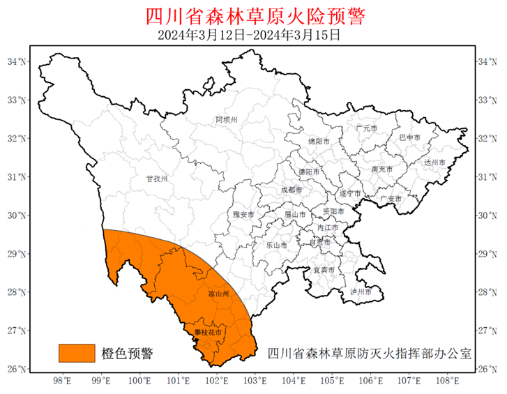 經(jīng)省森防指辦公室與省林草局、四川氣象局及相關(guān)地區(qū)會(huì)商,預(yù)計(jì)3月12日—15日攀枝花市,甘孜州西南部,涼山州西部、中部和南部(涉及17個(gè)縣級(jí)行政單位,具體范圍見附件)森林草原火險(xiǎn)等級(jí)將維持在高度危險(xiǎn)級(jí)別,特發(fā)布高森林草原火險(xiǎn)橙色預(yù)警。